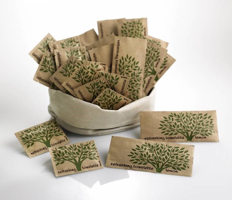 Salvietta rinfrescante in TNT biodegradabile, imbustata singolarmente, aroma al limone